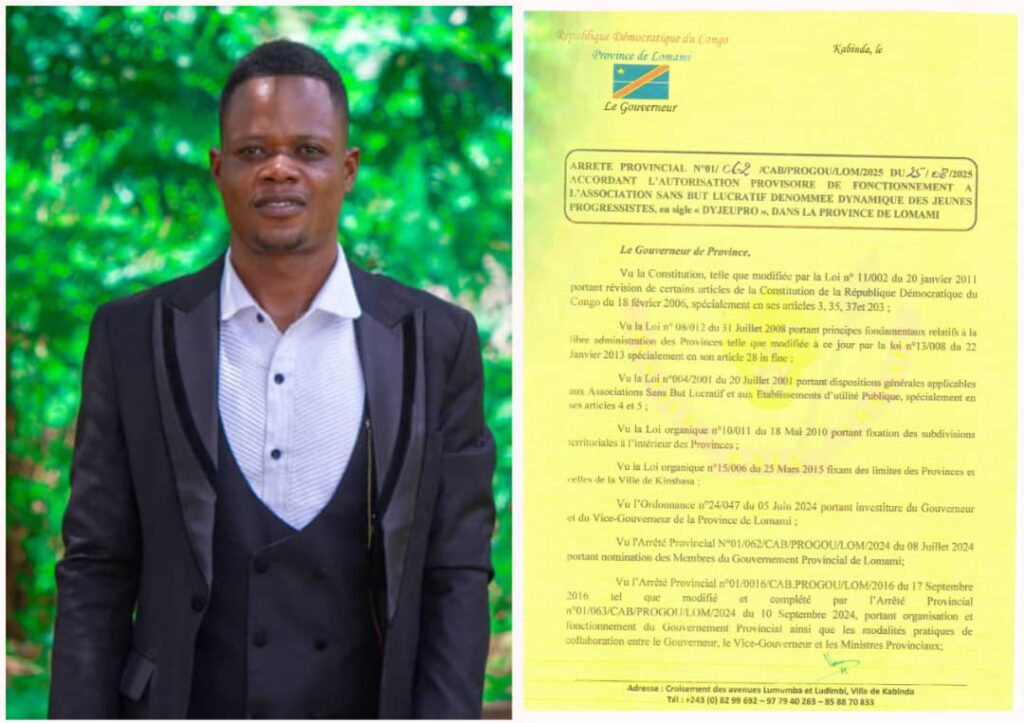 Portée par une jeunesse engagée et ambitieuse, la Dynamique des Jeunes Progressistes (DYJEUPRO) vient de franchir une étape décisive dans son parcours. Cette organisation de la société civile basée à Mwene-Ditu a obtenu son autorisation provisoire de fonctionnement grâce à l’arrêté provincial signé par le Gouverneur de la Lomami, le 25 août 2025.