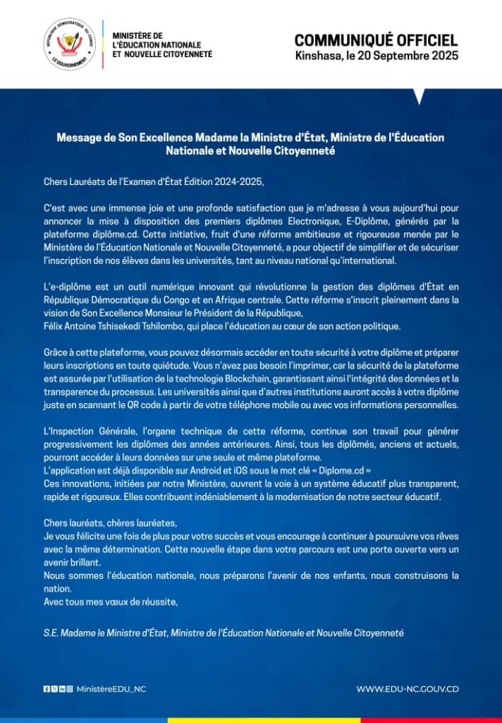 Accessible via le site officiel diplome.cd, cette nouvelle plateforme permet désormais la délivrance, la vérification et la sécurisation des diplômes d’État grâce à l’utilisation de la technologie blockchain. Cette démarche s’inscrit dans une volonté claire de lutte contre la falsification de diplômes, tout en facilitant les démarches administratives pour les anciens élèves, les universités, les employeurs et les institutions internationales.
