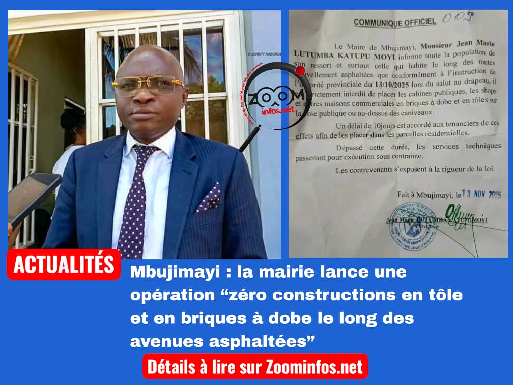Le Maire de Mbujimayi, Jean Marie Lutumba, a annoncé ce mercredi 19 novembre 2025 une nouvelle mesure interdisant l’érection de constructions en briques adobes ainsi que l’installation de cabines, shops et autres structures en tôle le long des avenues récemment asphaltées dans la ville.